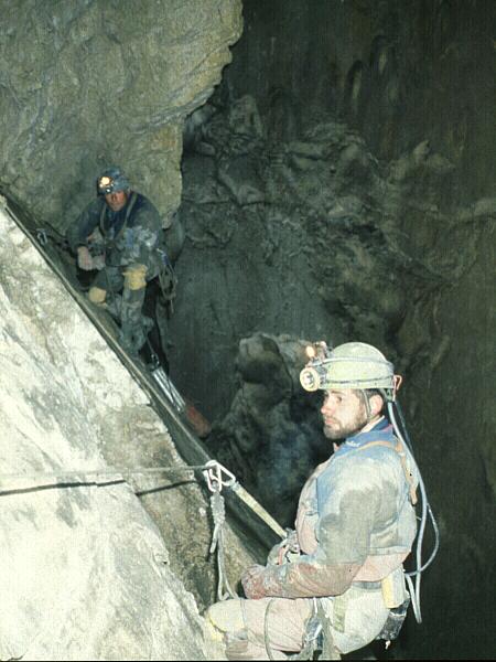Andy Atkinson (nearest camera) and Mike Baslington on The Gods' Traverse in Steinschlagschacht (1623/136). This is the airy bolted route which led to the connection to Elin Algor in Kaninchenhöhle in 1997. Photo © Julian Haines, 1997