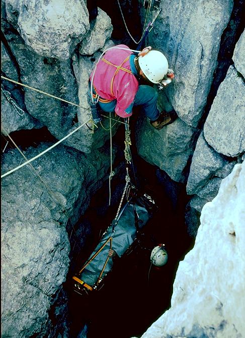 Becka Lawson reaching the top of the Kaninchenhöhle entrance pitch during her rescue after falling down the pitch below the Squeeze - subsequently known as "Becka Falls".