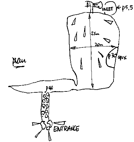 Latchensechsen is as hard as ever, and this short trip seemed more tiring than thirty hours down 115. Still, plenty of time to get fit. Poked around in the huge chamber, but the boulders are too big - size of houses. Surveyed in, and buggered off out.