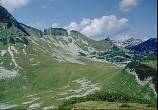 Take this left turn, up the west side of the grassy valley to a collection of six huts (seven from 1995) on level pasture near a number of small springs. The route to Bräuning Zinken passes these huts to reach the col to the left of the biggest peak - however this area is of little speleological interest. Our path crosses to east side of the valley and continues past a small limestone scarp on the right.