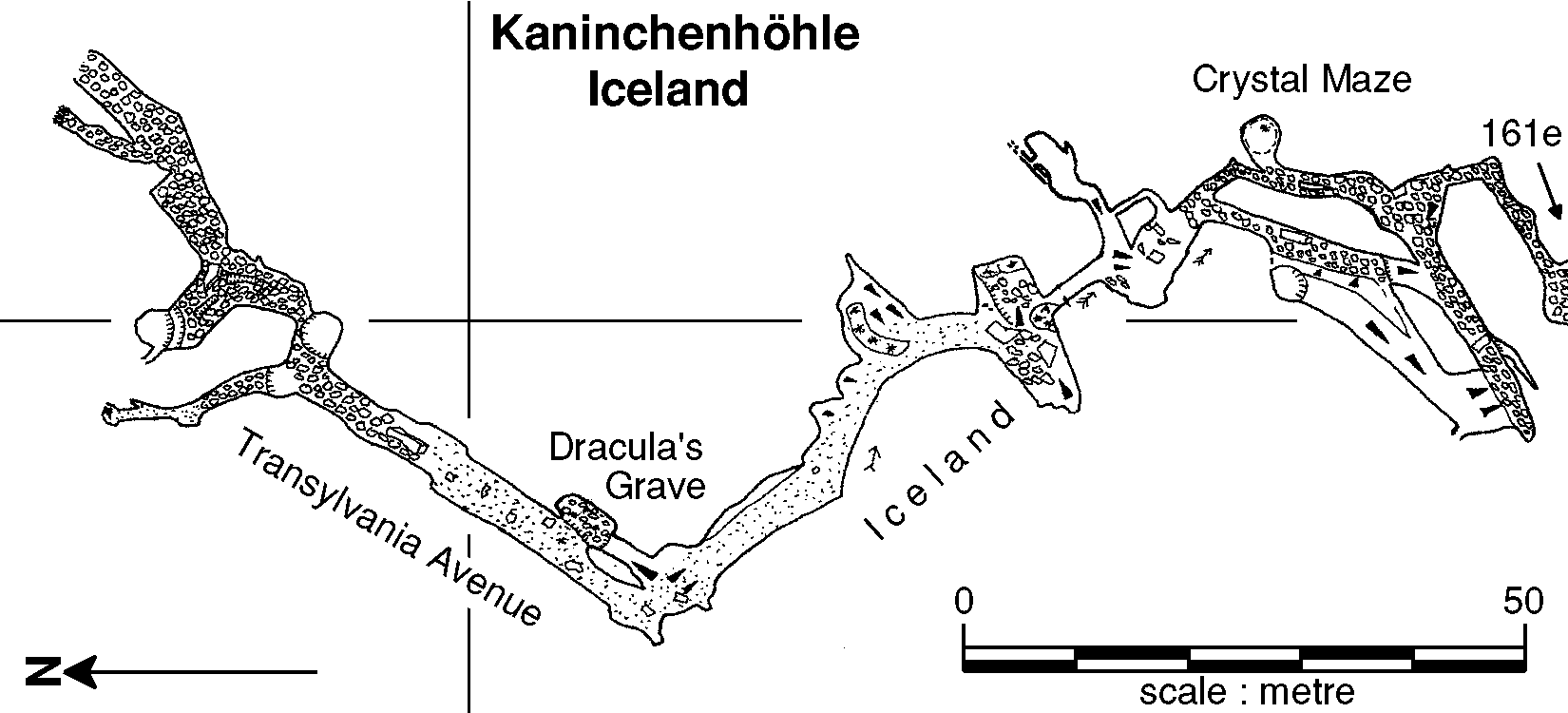 A passage on the right before the corner leads to a 3m deep rectangular ice filled pit, Dracula's Grave, which is also accessible by continuing on the main route. The passage enlarges to walking height and splits at a 3m deep blind pit on the right. The left hand branch is a narrow sandy rift which is blocked after 25m, though there may be a continuation higher up reached by a 3m climb some 5m back along the passage [C1996-161-24 C].