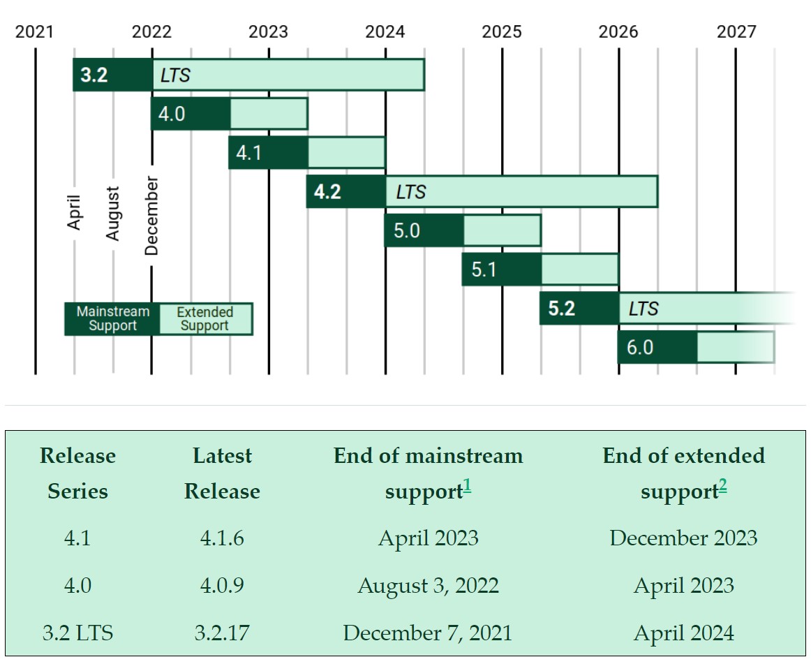 | 4.2 LTS | April 2023 | December 2023 | April 2026 |