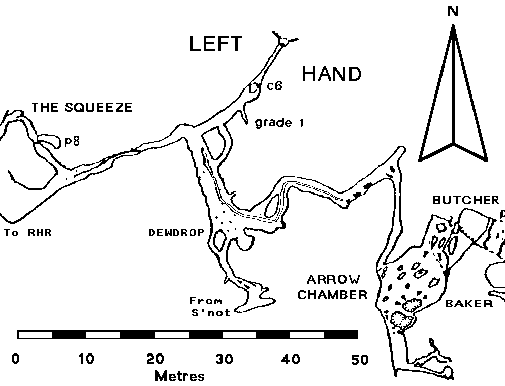 At the start of the Left Hand Route, as entered from Becka Falls, is a short length of passage with a 100° right turn, leading very quickly to the normal entry point at Dewdrop Junction. The false boulder floor of this passage was excavated just at the bend in 1992 (hence the subsequent need for a traverse line when going from Dewdrop Junction towards the Right Hand Route).