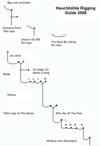 At the foot of the pitch, in large rift passage, a crawl on the left leads for about 15m before turning left and becoming too tight. Further along, another crawl on the left leads to Underhand Passage, while the main passage continues to a choice of a climb down of around 2m or an ascending traverse round to the left.