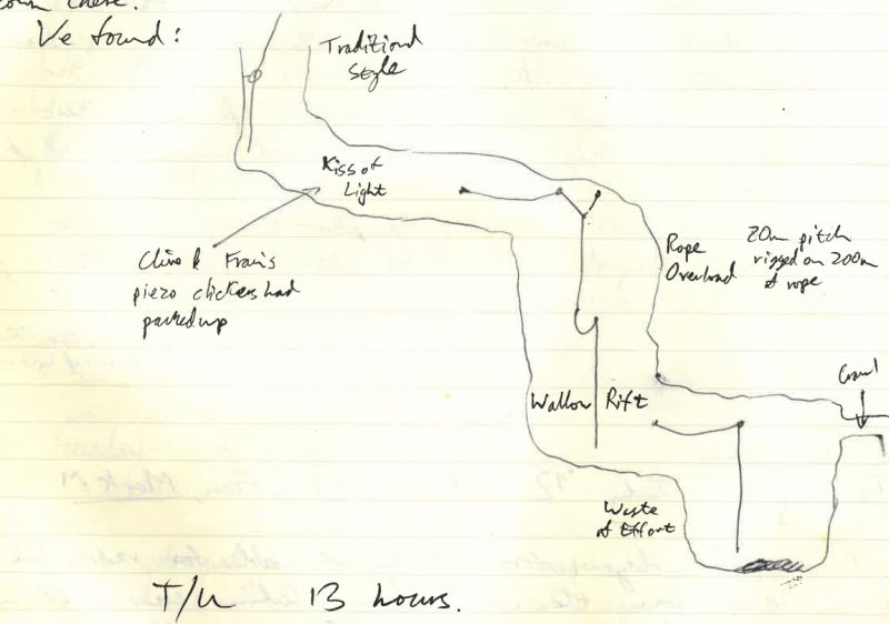A couple of days before 600m of cable for radios had been laid down the cave. Then Julian carried 200m of rope to the pushing front. Only one thing could happen next - we found the sump. We rigged two pitches after Traditional Style, the second of which was disgustingly muddy and ended in a sump pool the size of a dinner plate. Yuk ! However, this may not be the end because above the sump pool there is a muddy crawl going off for some distance. It is below the high water mark of the sump pool and clearly sumps when it rains, but none-the-less will probably be pushed on the next trip down there.