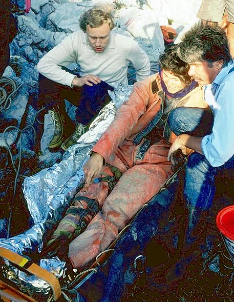 pointing out which bit of her leg is broken to the Austrian Cave Rescue