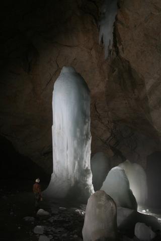 Shortly after I left, it sumped, leaving the cave at 622m deep. By the fourth week the pushing front was back up to -485m. Their ravenous appetite for cave far from satiated, the explorers traversed over the sump and into upward sloping sandy phreas, dubbed The Silk Road. Impressive formations appeared, including a fine trio of straw / stalactites and an odd mushroom-shaped erosion feature. After 200m of climbs and steep passage, the tubes opened up into the largest chamber CUCC has seen in recent years.