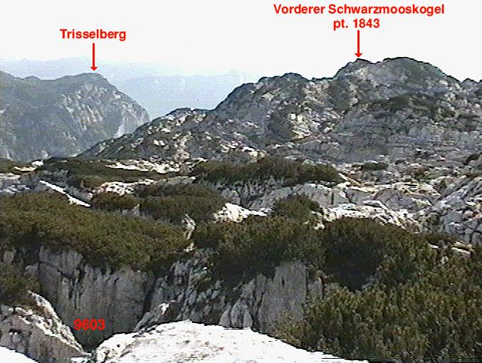 Entrance rift of CUCC 9603. The highest point of Vd. Schwarzmooskogel is pt. 1843, not always obvious, so bearings on here may not be reliable for relocating caves. The cross on the Trisselberg, whilst further away, is much more reliably identified.