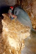 The main route on is reached by swinging off after 16m into a 6m wide passage. Two passages in the left hand wall are quickly encountered. The first quickly becomes too tight, the second is a short crawl leading into the network of sandy crawls at the bottom of Wolpertinger Way, and is the best route from here to the Ariston Series. Continuing down the main passage, passing either side of a huge boulder, reaches a blind pit in the floor, with two ways on.