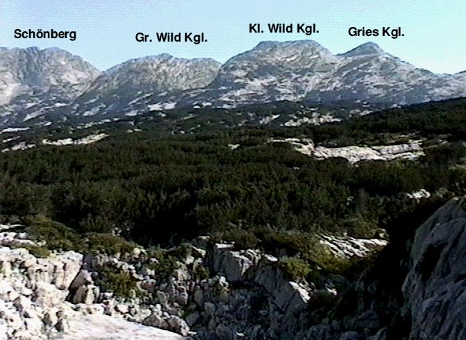 This is a view from just above Old Top Camp (to the left of the Sattel) out across the centre and eastern half of the Loser-AugstEck Plateau, typical of the first view a new visitor gets (if the weather is good). The highest peak is the Schönberg, the highest point of which has a cross, and is in the centre (below "hö" in the picture. The peaks to its right are all lower but nearer. Bearings on the Kleine Wildkogel should state whether the right or left hand end of the peak is being used (or take bearings on both !). Just in front these peaks is the beginning of the adjacent 1626 kataster area. The bivvy used since 2000 is out of sight to the right.