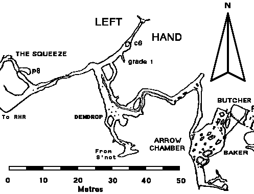 At the start of the Left Hand Route, as entered from Becka Falls, is a short length of passage with a 100° right turn, leading very quickly to the normal entry point at Dewdrop Junction. The false boulder floor of this passage was excavated just at the bend in 1992 (hence the subsequent need for a traverse line when going from Dewdrop Junction towards the Right Hand Route).