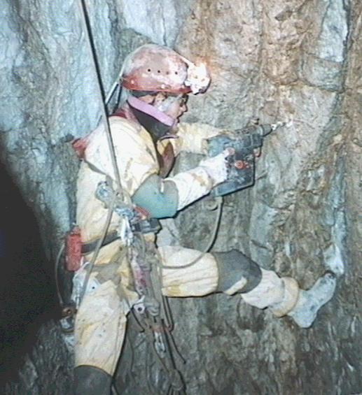Wookey with the Bosch drill, on the 161 entrance pitch, demonstrating the drilling of a placement for a rebelay, though actually taken on the final derigging trip in 1990.