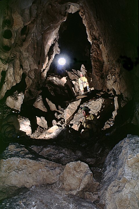The boulder slope down towards Windy Bottom in Oatso Simple - the first big passage in the 1999 discovery "Chile" - 2½ km of impressive passages reached by simply walking through a lead missed during derigging in 1997.