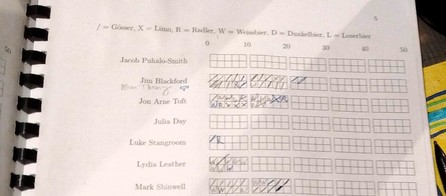 The record of the number of beers (and other drinks) that each person drinks from the common store in the potato hut looks like this. This is used when the treasurer does the final accounts reckoning after the end of expo.