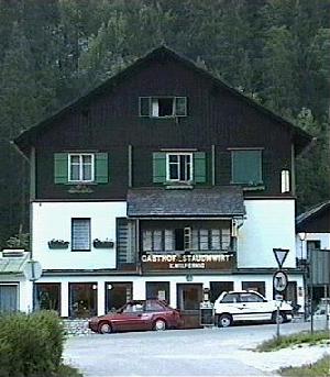 Eventually we outgrew this rather restricted space and moved to the other side of Bad Aussee, at Gasthof Staud'nwirt, by the road to Grundlsee. Here Hilde and Karin Wilpernig have made us very welcome for many years, and have provided us with many luxuries including some office space in 1984 and use of the "Potato Hut" ever since, which has sported a fridge for cold beer since 1995! So vital is this to expo morale that some passage has been named after it.