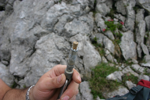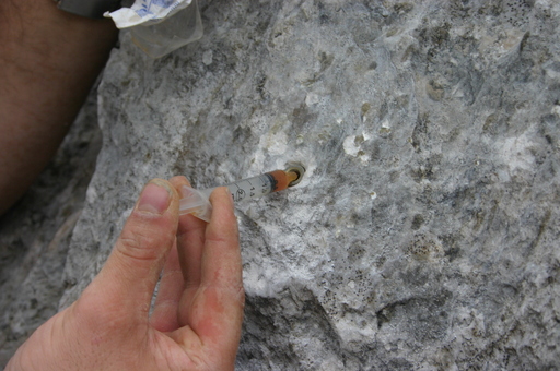 Finally, squirt a bit of grease into the spit to keep it from corroding. Notice that this spit is rather deep in, and would probably be rather hard to use for a rigging bolt; more dressing would be needed as well. This bolt was actually for the tag on cave 2005-07, and tag bolts clearly needn't be all that strong.