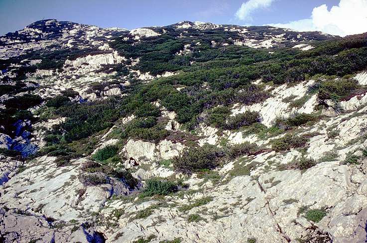 View across the plateau towards Hinterer Schwarzmooskogel (skyline to left). Bräuninghöhle (1623/82), found by CUCC in 1977, is the walk-in entrance about a third of the way up the diagonal from the bottom left corner. The 161a entrance is just over the skyline on the right.