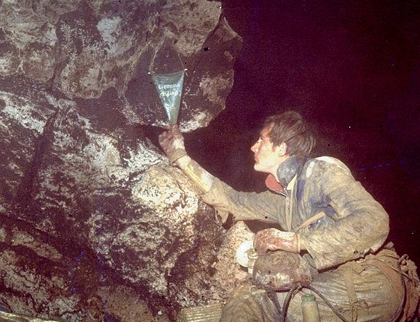 Ben van Millingen with the Greene King pennant on the balcony at the head of the 7m pitch into the "Hall of the Greene King" in the 506m deep Eislufthöhle (1623/76).