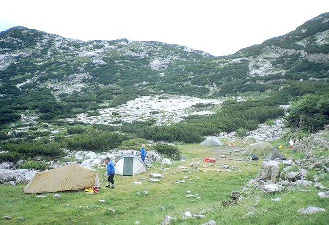 This is the upper of two alternating sites of CUCC's Top Camp for the last several years. An area of fairly flat grass next to a supply of flowing water is unusual on the plateau, and this has proved to be an exceptionally useful base, despite being exposed to the frequent poor weather. The view is in the direction of the approach to Kaninchenhöhle.