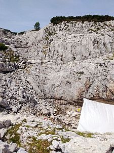In 2001 people decided to bivvy nearer to the the cave entrances. This involved putting up tarpaulins in natural shelters, and sleeping on inflatable lilos. The 40 bivvy is in the main 40a Eishöhle entrance. It is surprisingly comfortable as this entrance does not have a cold gale coming out of it, and the floor is very flat. It is luxurious for 2, comfy for 3 and can sleep 4. Water is collected by putting a tarp. in a steep gulley opposite with a hose to a butt in the bivi - very effective.