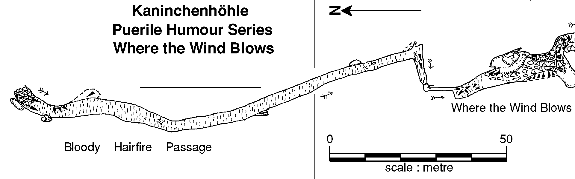 This series trends almost due north and is substantially linear in nature with numerous shafts and avens appearing along its length. It is unusual for the Puerile Humour series in that it draughts out (ie. towards Triassic Park) in the summer. The series is some 70m higher than, and passes less than 100m to the east of East Anglia at "The Far End" of the 'old' cave.