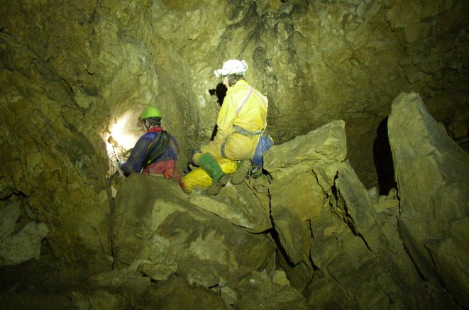 Dave Loeffler beginning to rig the climb down from Magic Roundabout Chamber that leads to the top of the Gaffered to the Walls series (watched by Becka Lawson). (This 4m drop is free-climbable but very loose, and was rigged after Dave fell off it in 2002, luckily escaping injury.)