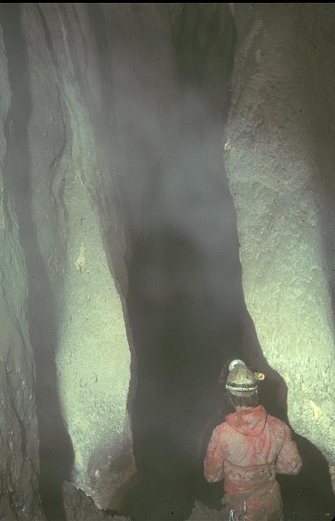 Julian Griffiths at the deep rift sump, c-506m in Eislufthöhle (1623/76). The sump was discovered and photographed and the bottom half of the cave derigged on this final deep trip, with all five of the team reaching the bottom (Julian Griffiths, Simon Farrow, Nick Thorne, Andy Waddington, Ben van Millingen) 13th August, 1979.