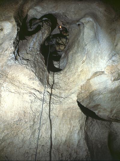 The 5m pitch which drops from the constricted Kein Zimmer section of Wheelchair Access series into the much larger Lost World passage, in Kaninchenhöhle.
