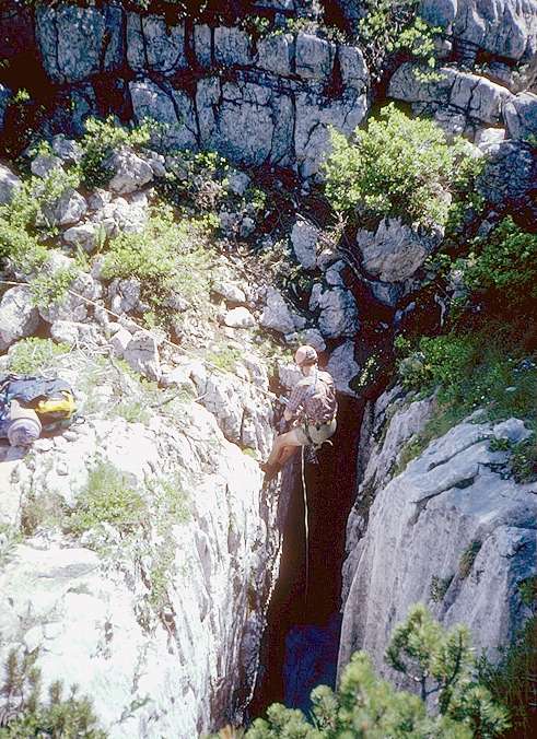 This sort of entrance is typical of prospecting on the plateau. Also typical is the fact that no-one could find the shaft again in 1993. It was given number CUCC93-01, and re-found in 1995, but no gear was to hand. Thus it remained unexplored beyond this surface shaft until 1998, when it was finally bottomed in three trips, numbered 1623/200, and very definitely fixed by GPS and surface survey and marked with a metal tag. We won't be losing that one again, at least !