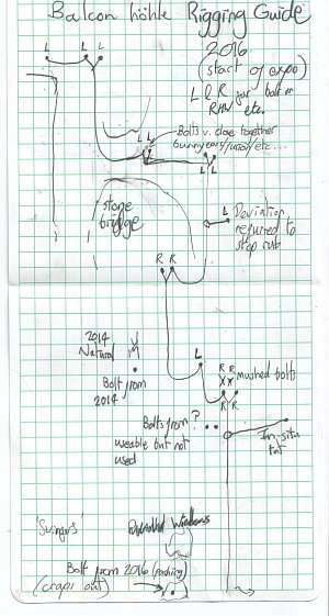 A Rigging Guide of the vertical sections is published with the cave survey and the cave passage descriptions in the cave guide after surveying is complete. This is usually easiest to do as a sketch, but must include notes to ensure that all bolts can be found again and any deviations and natural belays recognised for re-rigging in future.