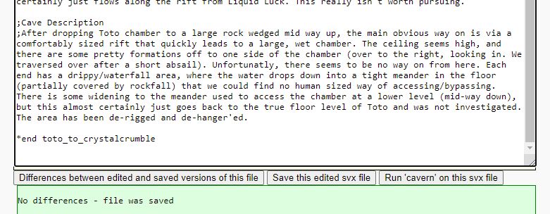 So for an existing cave, where someone has already done the initial cave registration process, you can easily add in your description of your new passage by cutting and pasting from your survex file, e.g. toto_to_crystalcrumble.svx into the end of the text in the "Underground description" text box.