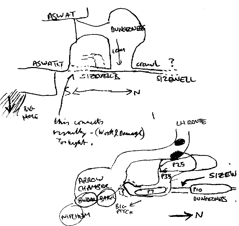 Trundled over loadsa boring limestone get to cave about to die. Put on caving gear. Too hot. lobbed off down some nice greasy slimy fast 11mill Edelrid and I rigged the last deviation this time with a light. I wandered around. Del came down. Trumm Trumm. Lots later Wookey came down with some rope and hangers. Rigged second pitch with half a ladder and some Bluewater "11mm steel hawser" rope. We rambled off round Dungeon pitch climbed something a bit silly over Dungeon found some new passage [Umleitung - Ed] a 15m or so pitch more passage extending parallel to B Sainsburys. Climbed down in an epic style. ran back rigged 3rd pitch (well Del did!. I ran off and rigged pitch traverse round to Dreamtime with Dave and Geraldine with lots of style. Del Rigged wth pitch. I ran down after (clatter, clatter), Saw squeeze pitch. We re-rigged 3rd pitch (again apparently) and came out.