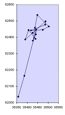 There were 723 track log points, taken in 50 sections at 41 positions (some places were logged more than once to see what repeatability was like - (see Figure 2, page 15). For each section of logging the average position was calculated in X & Y. At this point I have to explain the complications of co-ordinate conversion. This is by far the biggest problem in using a GPS. Although the unit knows all about a whole host of co-ordinate systems and origins, the serial data downloaded is always in Lat./Long. format using the WGS84 spheroid. When you record positions they are likely to be in the locally useful co-ordinate system, and this is what you will need to plot positions on the map. In the UK this will be 'OSGB'. On an expedition you need to do a bit of research to find out what you should be using and how to do the necessary conversions. The OS publish a very useful couple of documents 'Transverse Mercator Projection - Constants, Formulae and Methods', and 'Conversion of Latitude and Longitude to/From National Grid'. I have photocopies of these if anyone needs them - they may now also be available on the net. These sums have been turned into a DOS program called 'CONVERT.EXE' (imaginative stuff!), and a RISCOS Basic program, both of which I also have.