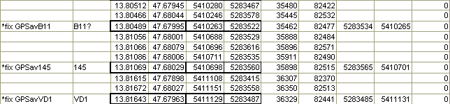 The easiest way to get this into Survex for plotting is to put in a column that says *FIX <stationname> in front of these columns, and putting an altitude value in at the end. Then by hiding all the data lines, and all the columns except the G&K (Austrian) ones, this section of the spreadsheet can then be exported to a text file and processed directly. By including the waypoints marked in the field (and given a similar treatment to the track log data), it is possible to see whether the averaged results are noticeably better than the waypoint results.