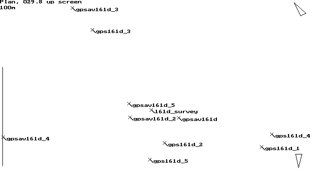 The averaged positions for locations 1,2 and 5 are all within about 25m of the surveyed point 161d, whereas the waypoints 1,2 & 5 are all 50-100m away. However the 3 & 4 averages are slightly further away than the corresponding waypoints. Location set 4 lasts for 25 minutes. After 20 minutes the position suddenly zooms off 500m to the E. It is this sort of odd behaviour that means a GPS reading alone can be thoroughly misleading. The bar on the left shows the 100m limit, and the readings are nearly all with in this, although not quite.