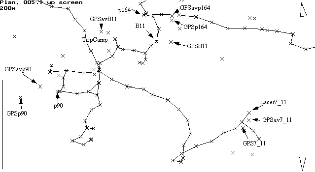 I have selected a number of locations, the corresponding GPS waypoint, and the averaged track log data for it. As you can see the averaged data is closer to the actual point than the waypoint for Laser7_11, p90 and p164, although in the case of p164 there is hardly any difference. These locations were averaged for only about 20 minutes. The B11 data illustrates the importance of examining the data graphically, and checking suspicious stuff. The point marked GPSavB11 Was one where the track log had clearly rested somewhere for a few minutes, and the timing (at the end of a day), and known route that day suggested that it was B11, done on return to top camp. This was what got written down (with a question mark in the spreadsheet). After all the grid processing and displaying the results in Survex I note that the waypoint at B11 is much closer to the known position of the cave than the GPSavB11 location. A quick check back to the track and waypoint data shows that the waypoint was done two days later, and that there was a question mark next to the GPSavB11 name. This all means that this isn't B11 at all, but a short log at top camp whilst waiting for the tea to brew. Again - record keeping is essential to avoid this sort of mistake.