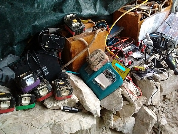 Partial view of the PV/car-battery Makita battery pack, phones, AAs and 18650 cell charging system at Steinbr?ckenh?hle bivvy. {Click to see full-size image.}