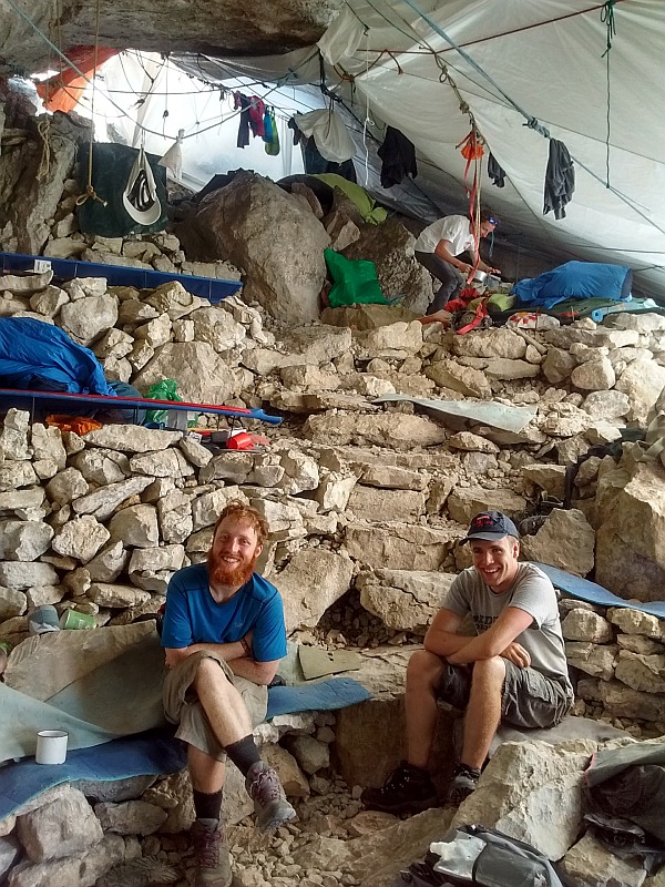 Rob and Jacob having just got out from our last underground camp of 2017 with the first of the rope and gear from the derig. We're hydrating at Top Camp before the two hour walk off the Plateau.