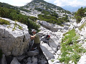 After 220 hours underground this summer with CUCC I've skipped derigging (obviously I'd have loved to have helped out but unfortunately the timing was against me) and I've decamped to spend a week with the local Austrian club (VHO http://vho-caving-news.blogspot.com/) on their Plankamira expedition. This made for quite a culture change - there's only 5 of us and we're all around a half century old. Now, at last, my rigging suggestions are listened to attentively (rather than being firmly squashed) and nobody passes comment about the volume of food I get through (George eats like a grasshopper). I've also escaped the unending put-downs - "if you're going to rig that pitch don't do a half-arsed job of it"; "that wouldn't have happened if you hadn't placed it in a flake"; "you and your slopy shoulders"; and "no, you can't lead us out, you're so bad it's just not funny" and so on. Also, it's relaxing not having to tell everyone what to do :-) Best of all, I'm now the fastest prussiker (yeah, yeah, of course it's not a competition).