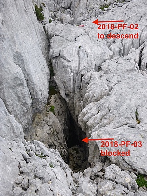 2018-PF-03 is an open rift between PF-01 and PF-02 about 5.6m deep, 1.75m wide, 4.6m long (as measured by Disto). Paul climbed down PF-03 and found it was choked at the end nearest (heading towards) the big shaft PF-02. Thus, it dashed all our hopes of finding a free-climbable access to the big shaft.