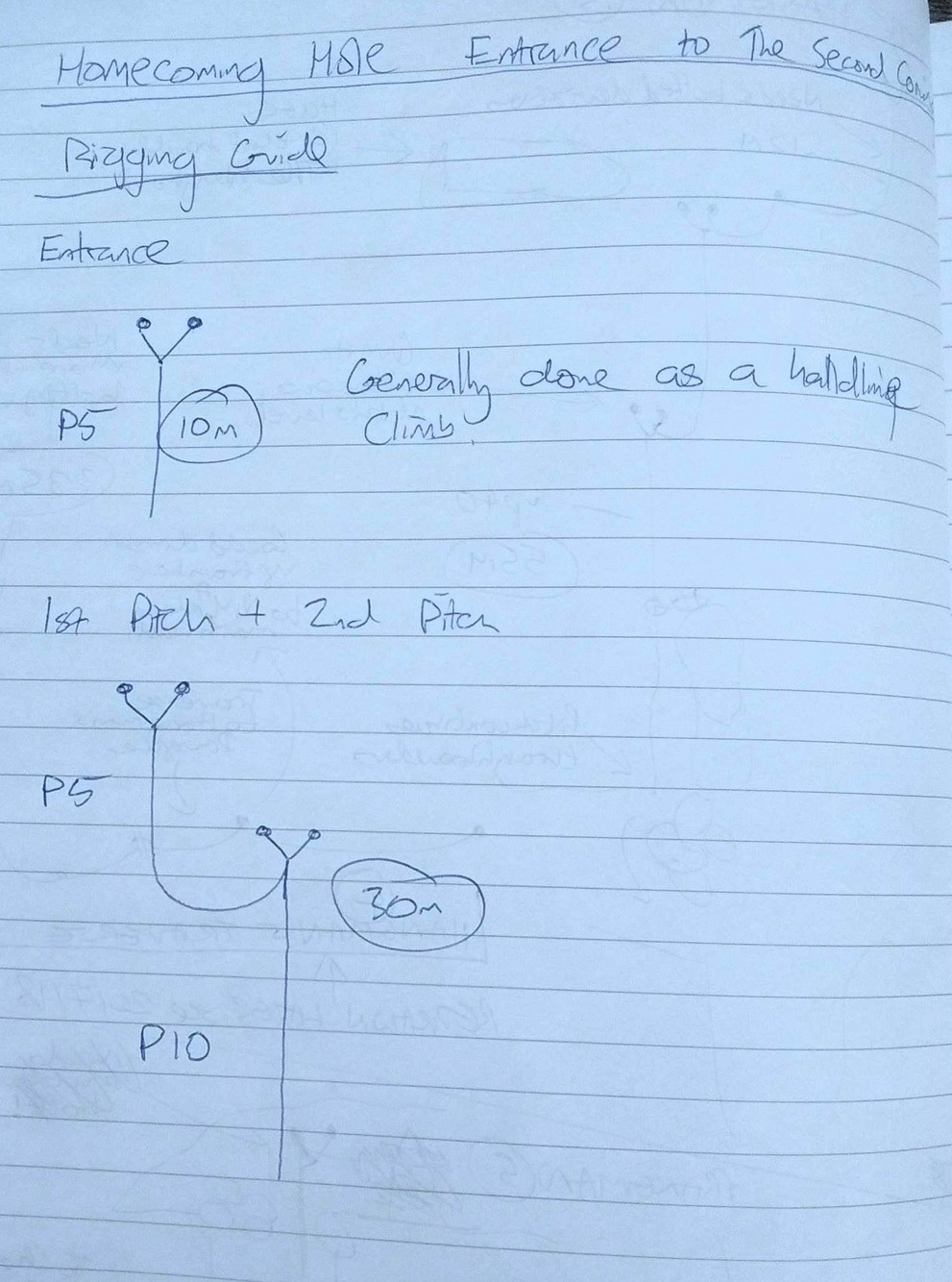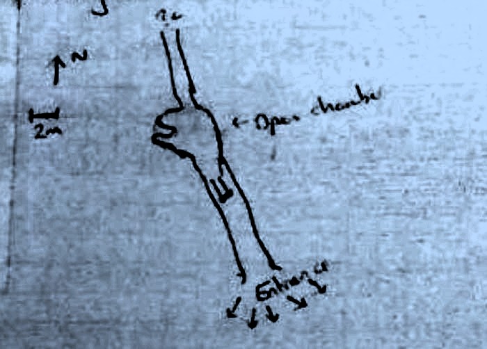 Climb down boulder tickle 5m leads to 2m climb. Rift continues to 4m pitch into chamber, unpushed.