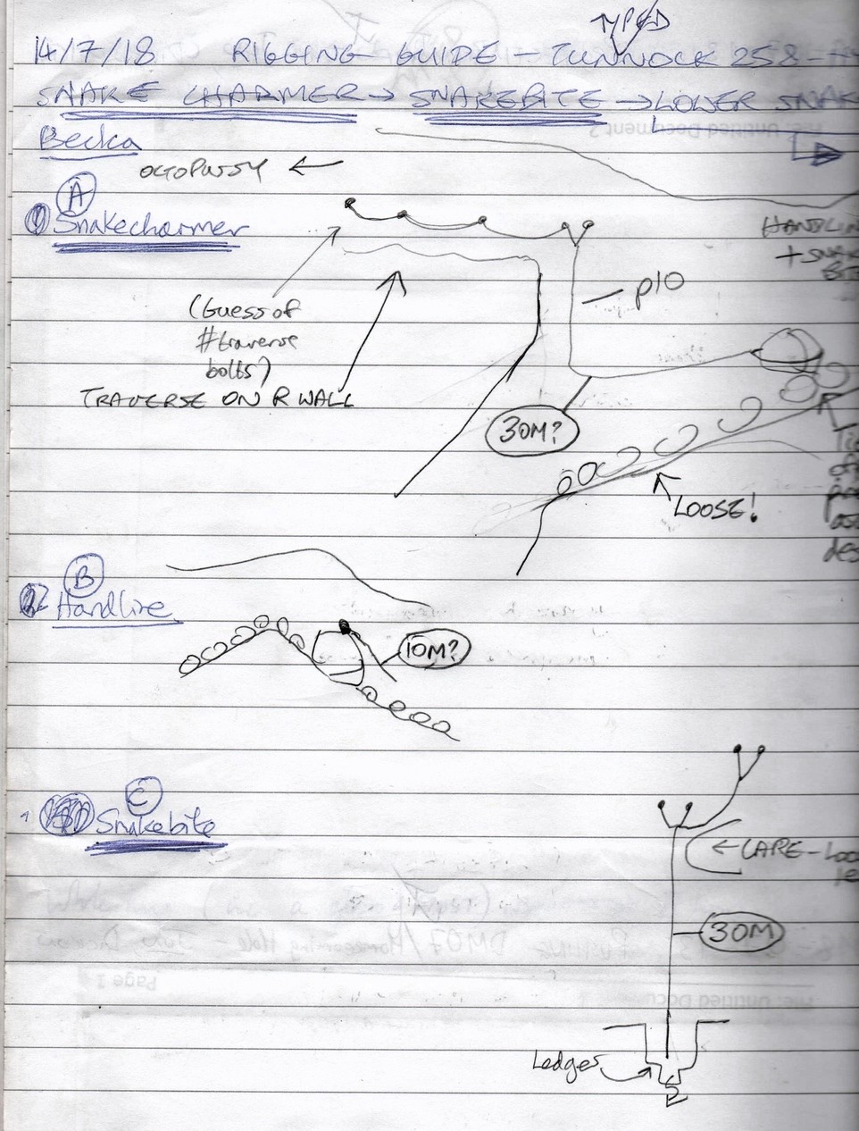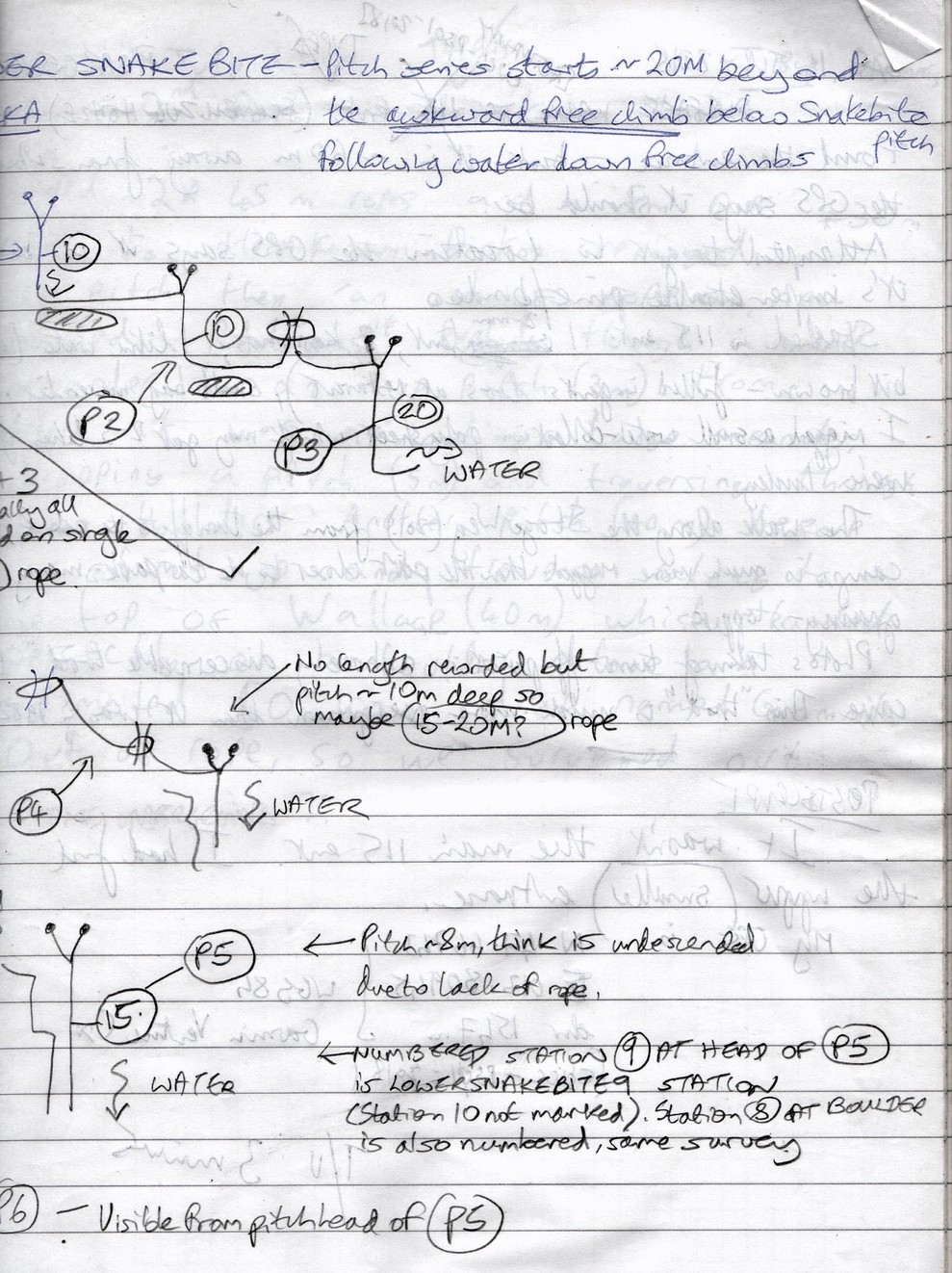 Snakebite lands in large rift passage with waterfall entering from LHS. Water drains down to Lower Snakebite (this starts with an awkward free climb next to water; themore obvious passage on L of this (as you face downstream) is main Snakebite passage (dry) that connects to Song of the Earth.