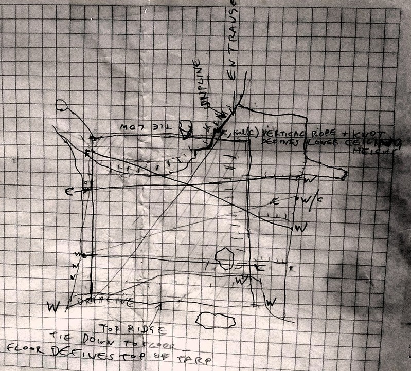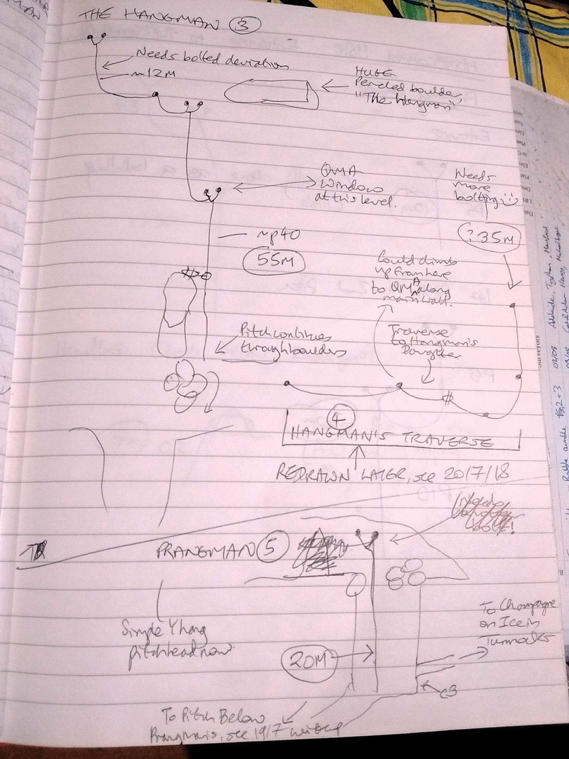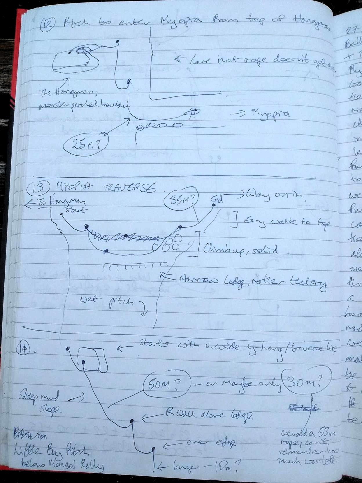 It was slow progress up the rest of the cave, barely keeping ahead of the deriggers (Luke and Max). At another free-climb I reaslised after >10 minutes of struggling that it was much easier to just throw the bags up and then chimp up after them. At the surface, I debagged and lay looking at the stars for a couple of minutes, before returning to the first pitch to take Rad's bag. He was decidedly less talkative than usual, and had the look of a man who needs a break - "it's just quite a heavy bag for a first trip" - I was inclined to agree. I saw another 3 meteors in the space of 20 seconds before going back to sketch a rudimentary diagram of the entrance traverses and take one bag from Max, and then back again for another. Realistically, it was the easiest bit of the bag carry, but it was hard thinking of Luke and Max doing all that work and not rying to help out.