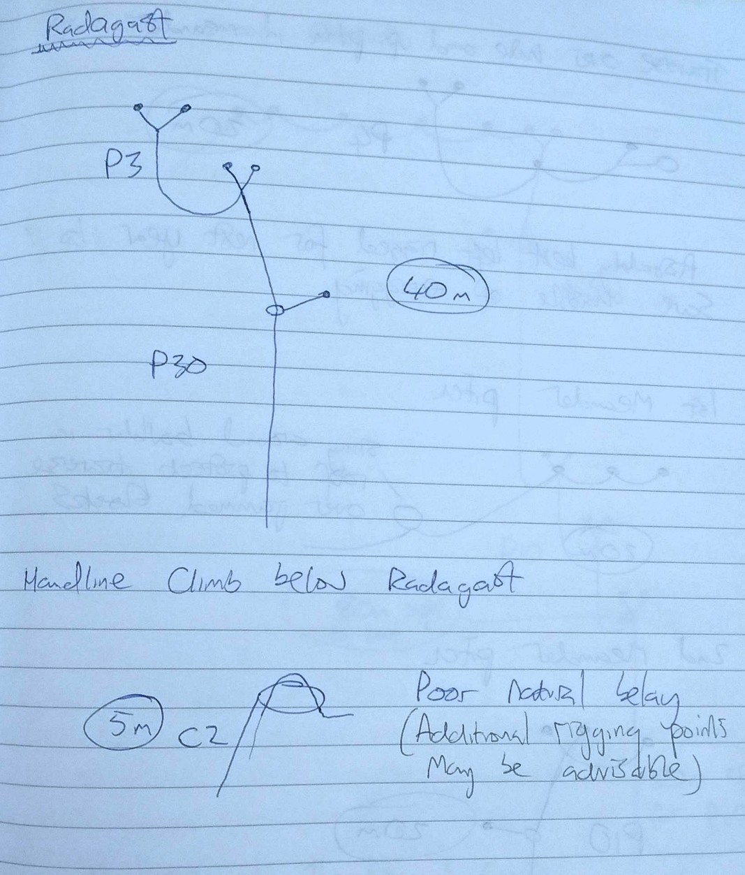 Carried 2x 45m ropes and a 80m rope over to Heimkommen. Dickon rerigged the pitch then ran out of rope on, now named Radagast.
