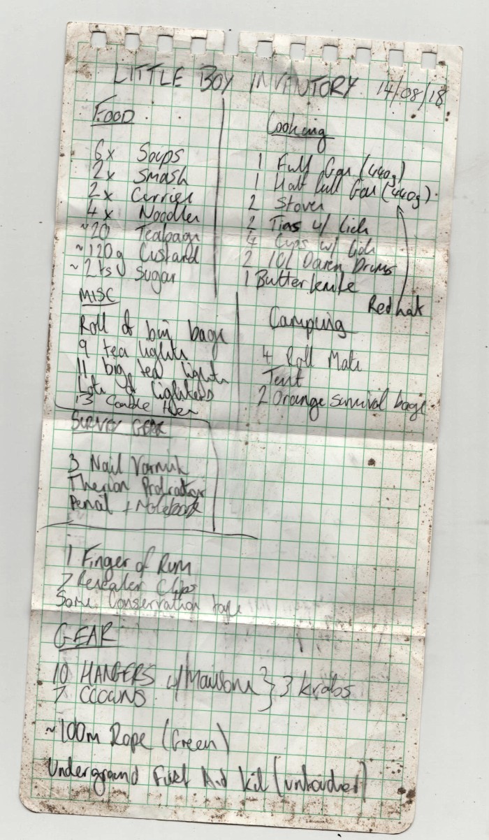 50m rope, hangers, drill, bolting kit, oversuits, helmets and lights.