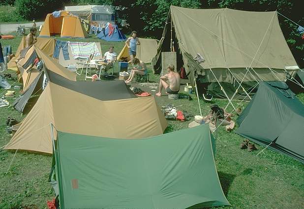 The mess tent, obtained by Dave Brindle after its previous incarnation as the beer tent at Craven Pothole Club Gaping Gill Winch meets. Featured festerers, at Base Camp at Seecamping Madlmeier in 1982: Doug Florence?, Tim Parker, Phil Sargent, Janet Morgan, Andy Dolby.