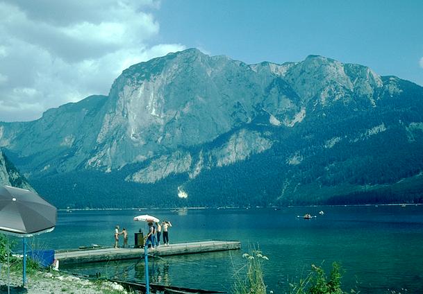 The Trisselwand seen over Fritz's jetty in Altausseer See, seen from Seecamping Madlmeier in 1981. Altaussee was our base camp from 1976 to 1982
