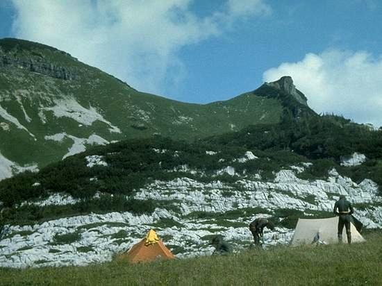 Tents of the 1977 advance camp on the pasture above Bräuning Alm. This is just off the path now used by CUCC on the walk-in to the current Top Camp at the edge of the plateau. The three cavers (Julian Griffiths, Nick Reckert and Steve Perry) are just getting ready for a trip into 1623/95, an open shaft just behind the photographer. Note that all are in wetsuits!