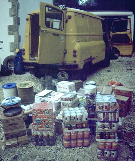 The "Yellow Peril", an ex-GPO telephones JU-250 van owned by Doug Florence had proved a faithful (if not always very reliable) form of club transport for some time before its trip to Austria in 1978. It had a new short engine just for the trip, as well as a new and astoundingly comfy rear bench seat welded in the day before departure. This didn't stop the alternator dying at Tunbridge Wells, but after that it performed heroically. Occasional use was made of a standard JU-250 exhaust repair kit, but driver and passengers were usually happy enough to consume the beans or rice pudding from this in order to effect the repair.... As the photo shows, such tins were just part of over 350 Kg of food which we took out on the 1978 expedition.