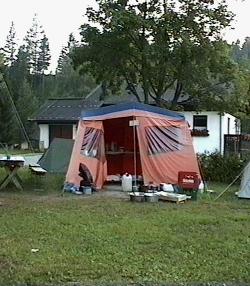 The mess tent at Base Camp at Gasthof Staud'nWirt in 1995, an unusually dry year.